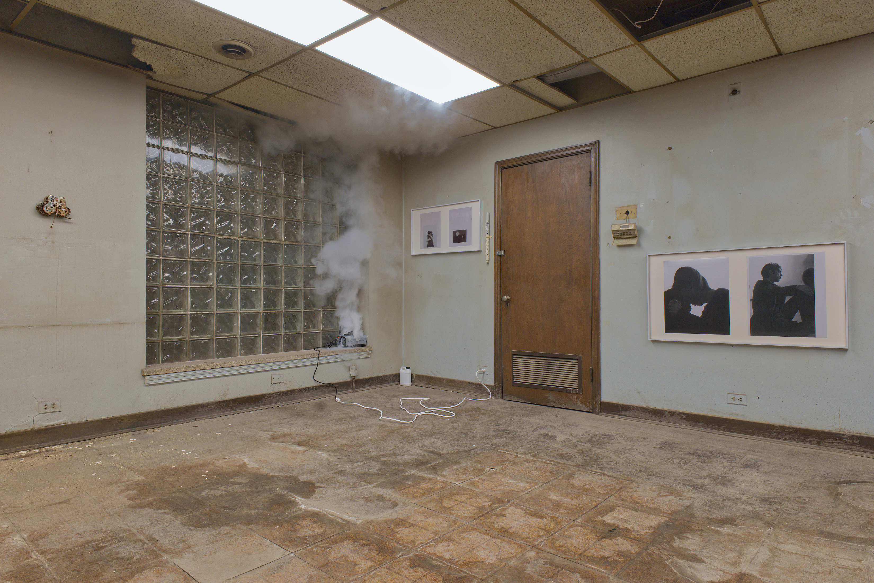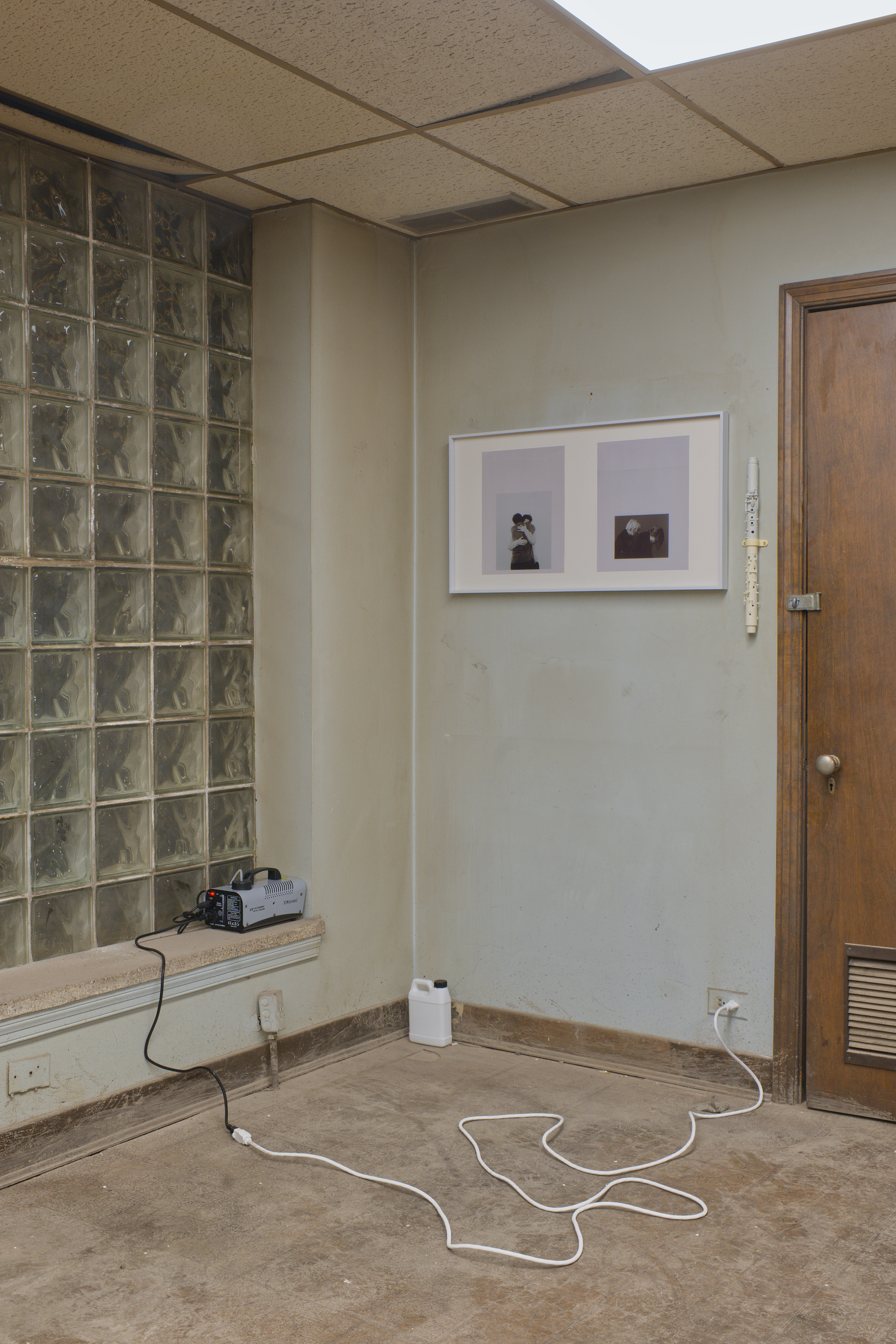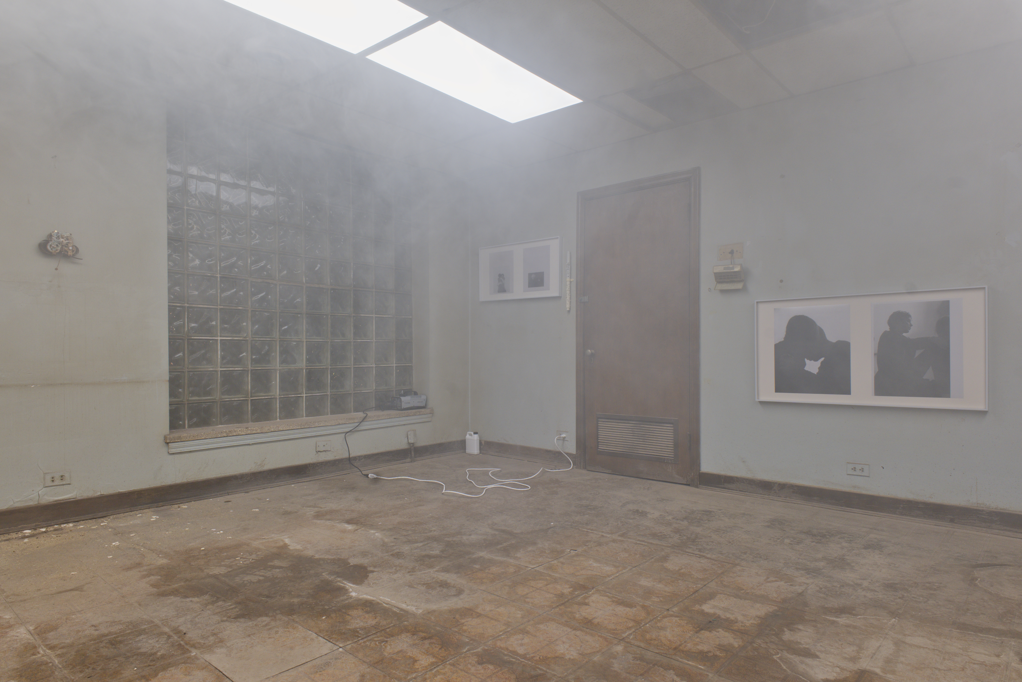 an infinite room, but still a room — photograph of choreographic work of the same name (performed by the artist), dissolved in liquid fog, Borgova 500W fog machine, broken clarinet parts, deconstructed floor lamp set to incremental timer, dimensions variable, 2025