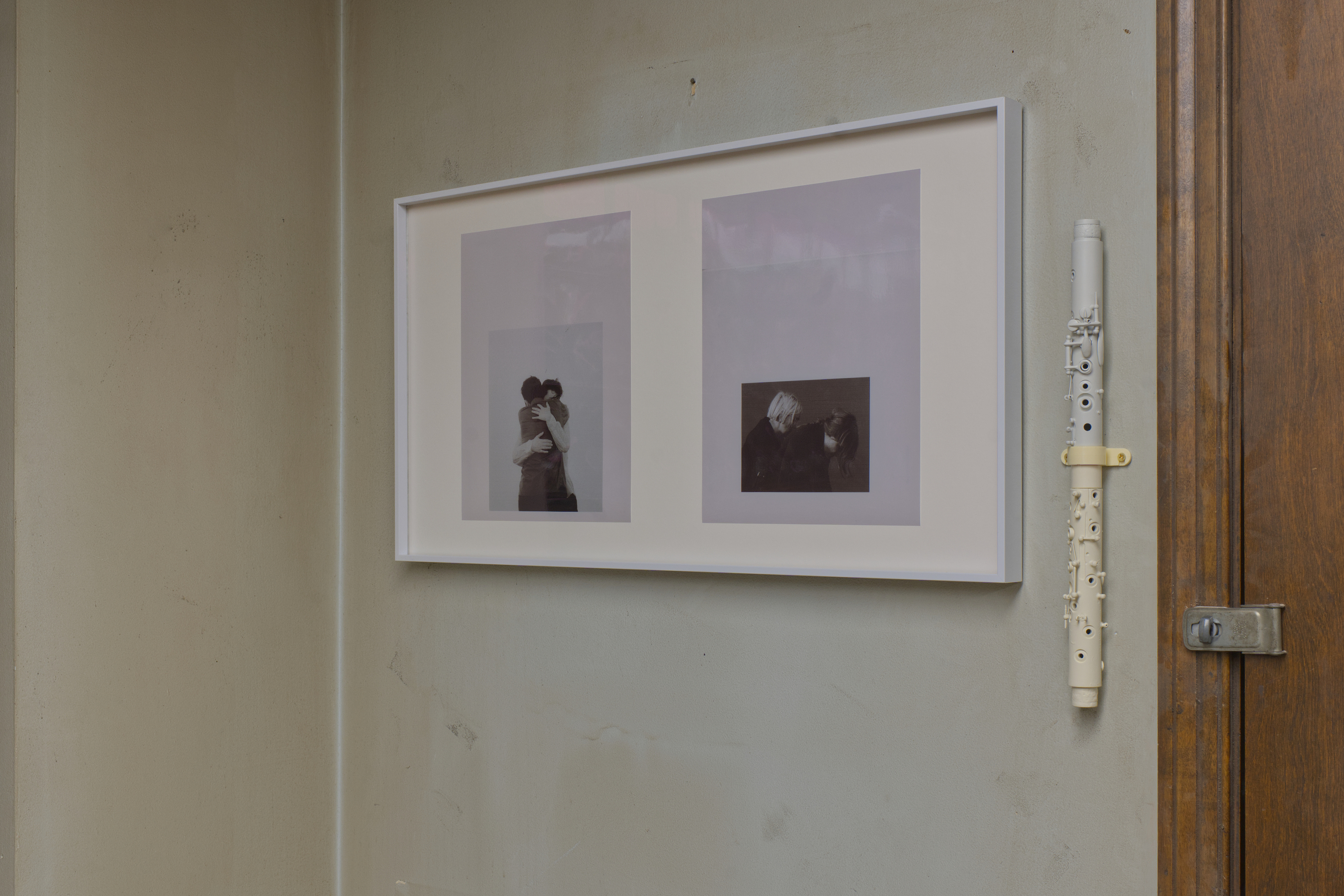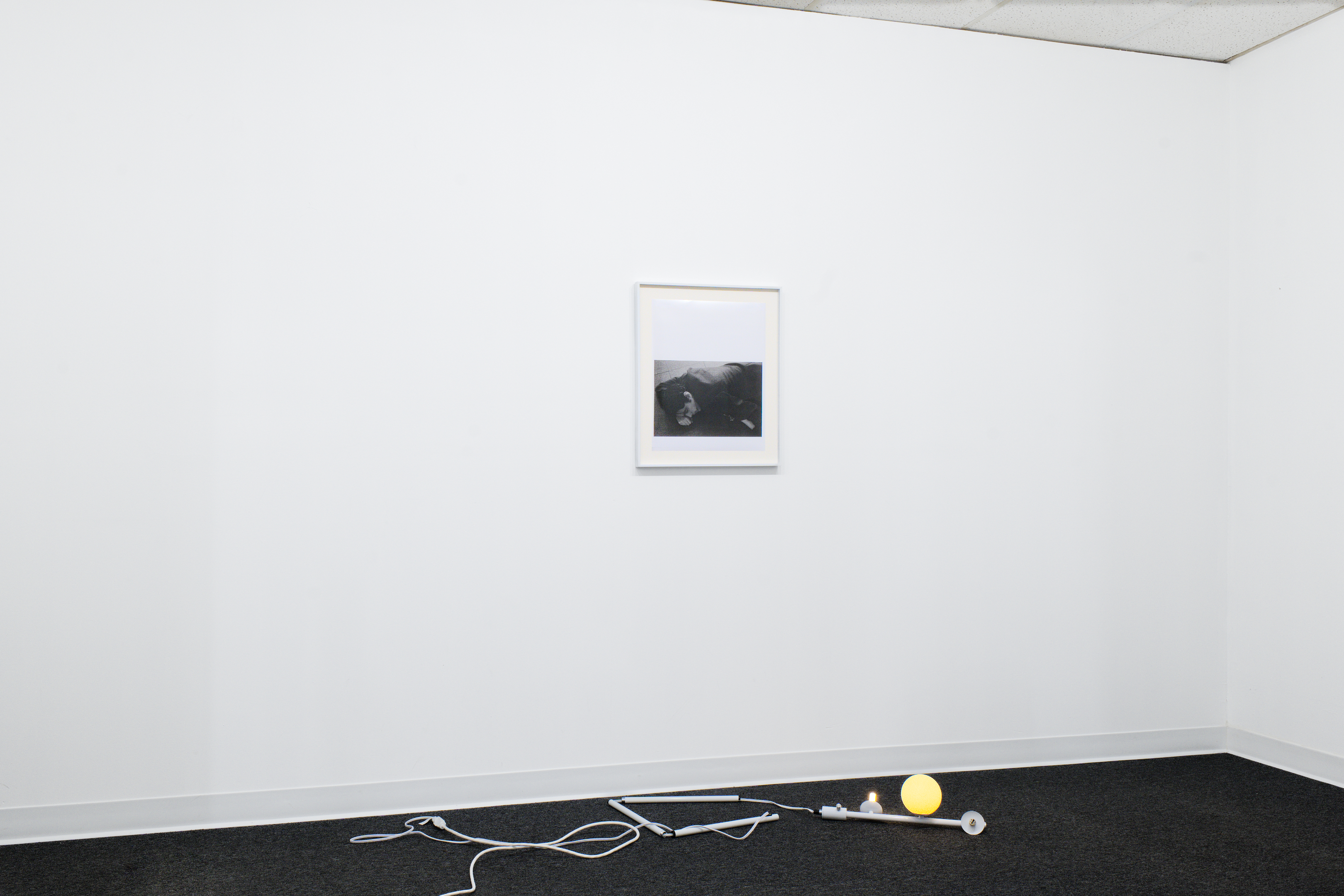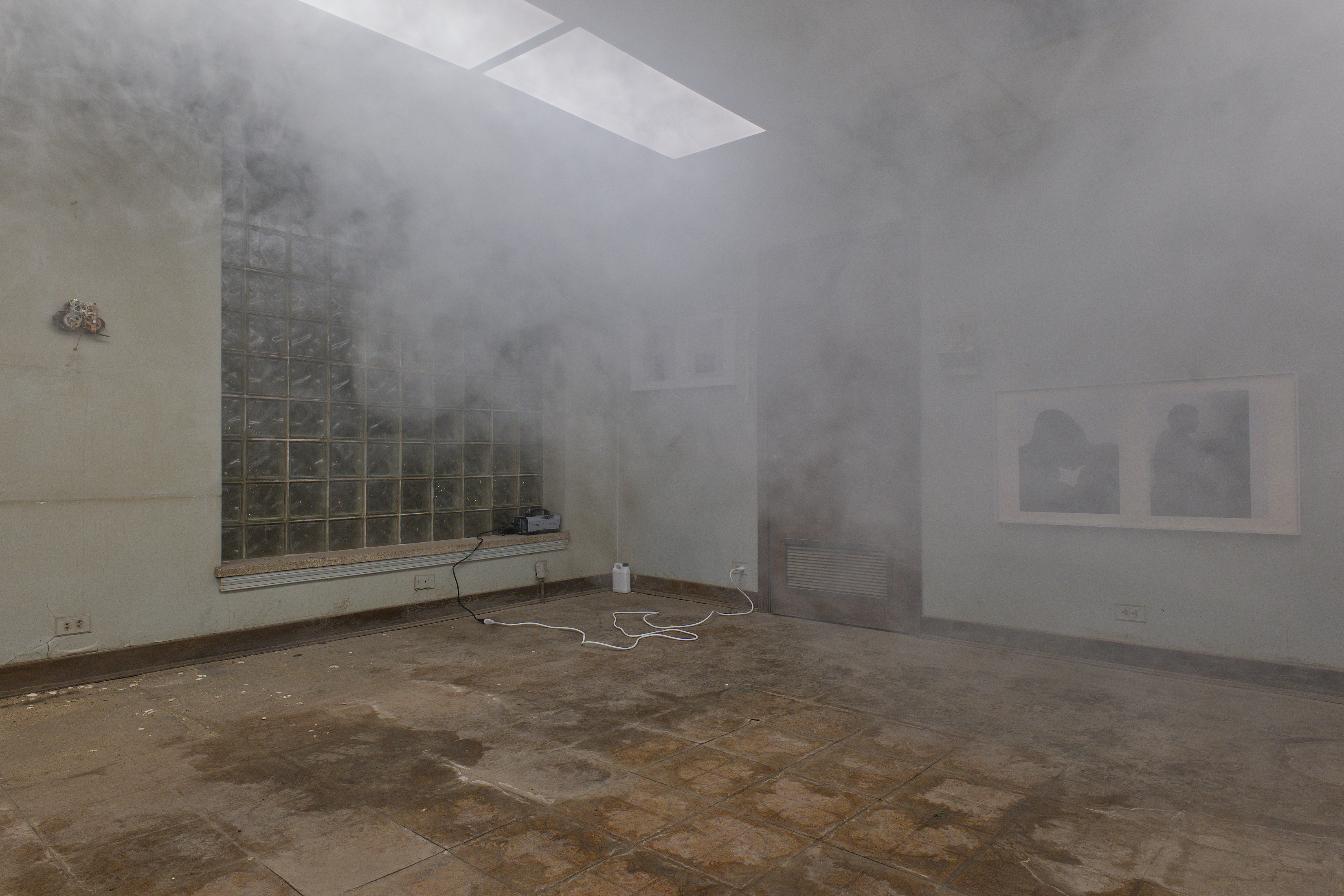 an infinite room, but still a room — photograph of choreographic work of the same name (performed by the artist), dissolved in liquid fog, Borgova 500W fog machine, broken clarinet parts, deconstructed floor lamp set to incremental timer, dimensions variable, 2025